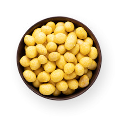 Цельный арахис в хрустящей сырной корочке, немного солоноватый с характерным сырным вкусом.