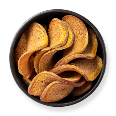 хлеб ржано-пшеничный (мука ржаная, мука пшеничная, соль поваренная, дрожжи хлебопекарные прессованные) масло подсолнечное рафинированное дезодорированное, жир жидкий для фритюра (масла и жиры растительные рафинированные отбеленные дезодорированные: масло пальмовое и ее фракции 321) смесь пряно-ароматическая декорирующая (молочные белки, соль поваренная, мальтодекстрин, глюкоза кристаллическая, экстракт дрожжей, усилитель вкуса и аромата Е621, диацетат натрия Е262, ароматизатор говядины и хрена, диоксин кремния).