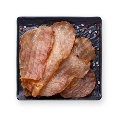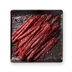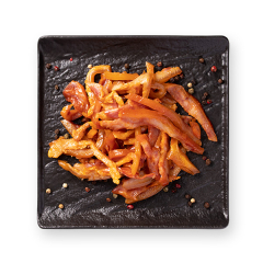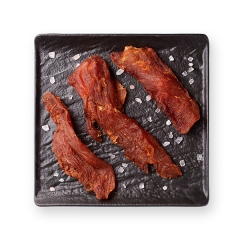 Тонкие вялено-сушеные кусочки куриного филе с острыми специями. Пряная сладковато-соленая закуска, которая хорошо подойдет к большинству сортов пива и не помешает в полной мере насладиться вкусом напитка.